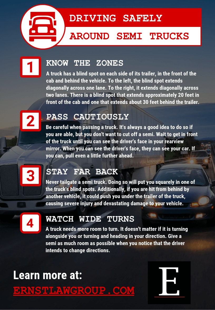 You also need to be careful driving beside or in front of a truck. If you can help it, never pass a semi truck on the right. Truckers have a massive blind spot on the right side, and there just isn’t a good mirror setup to cover it all. If you do pass a truck, make sure you can see the very top of the cab in your rear-view mirror before merging over. Once you get in front, stay well ahead if you can. Due to the size and weight of these trucks, they simply take farther to come to a complete stop — up to three times farther. All in all, the further you can stay away from semi trucks while you’re driving, the better off you’ll be.
